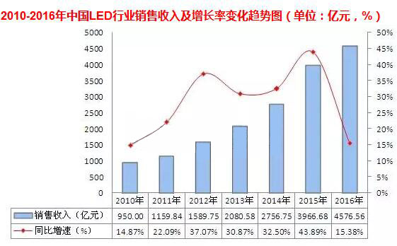需求方麵,2010-2016年,中國LED行業銷售收入呈逐年增長趨勢,其中2016年實現銷售收入4576.56億元,同比增長15.38%。