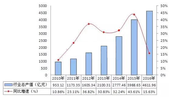 LED企業整體經營效益向好,源於LED產業產銷規模的穩定增長。數據顯示,2010-2016年,中國LED行業工業總產值呈逐年快速增長趨勢,2016年實現工業總產值4611.96億元,同比增長15.63%。